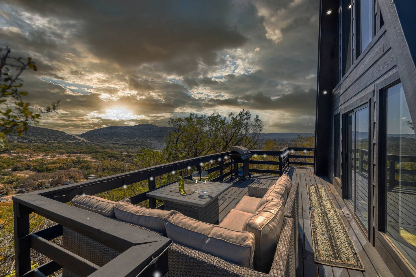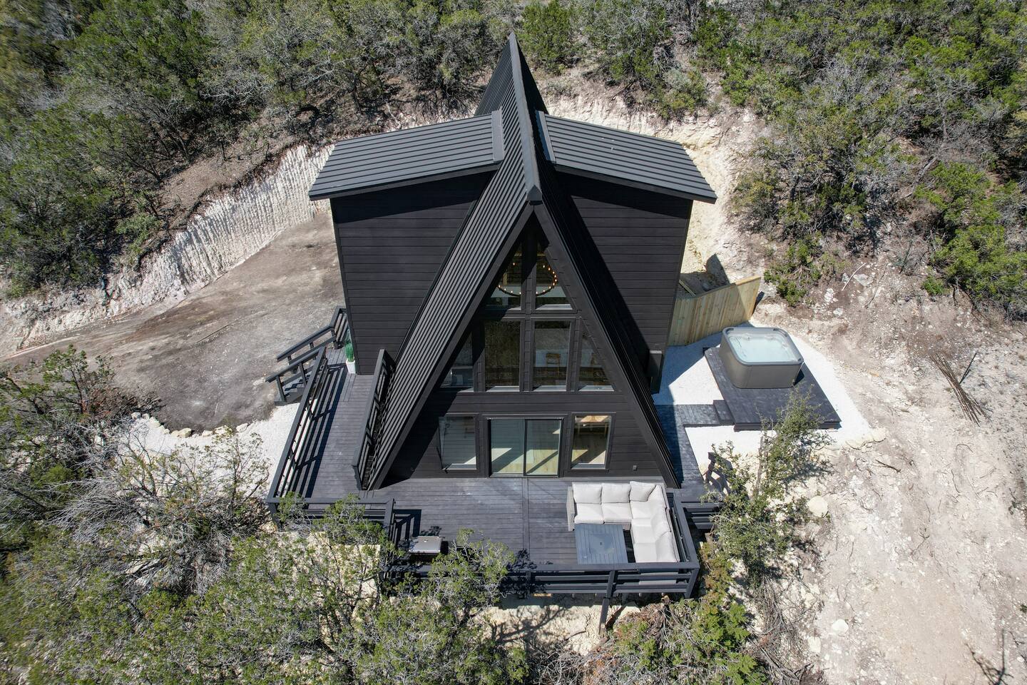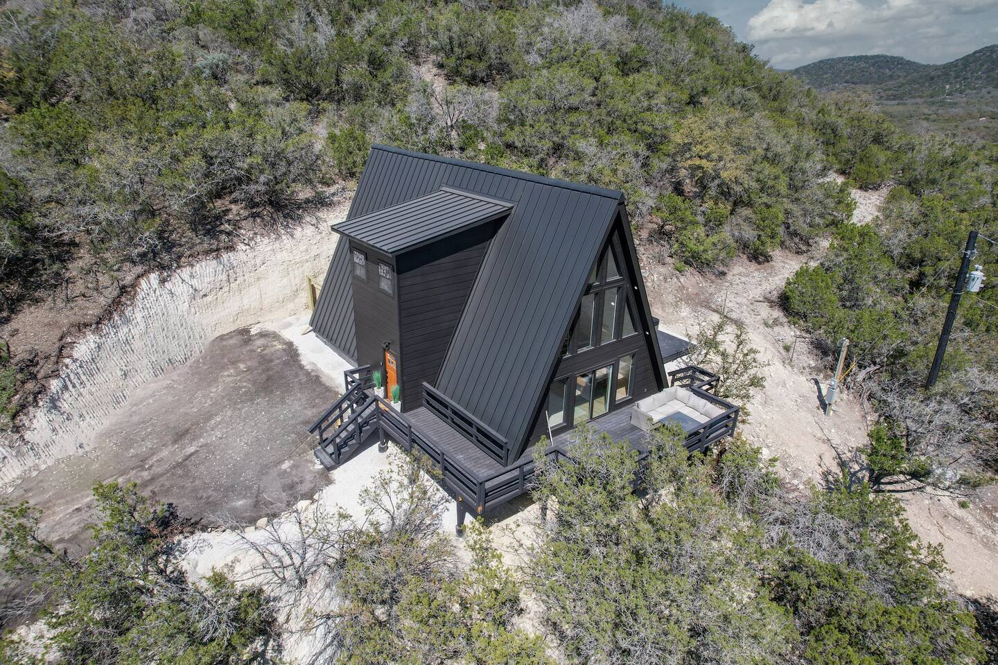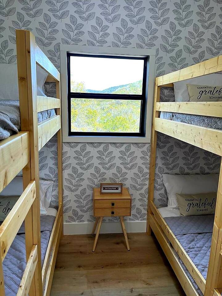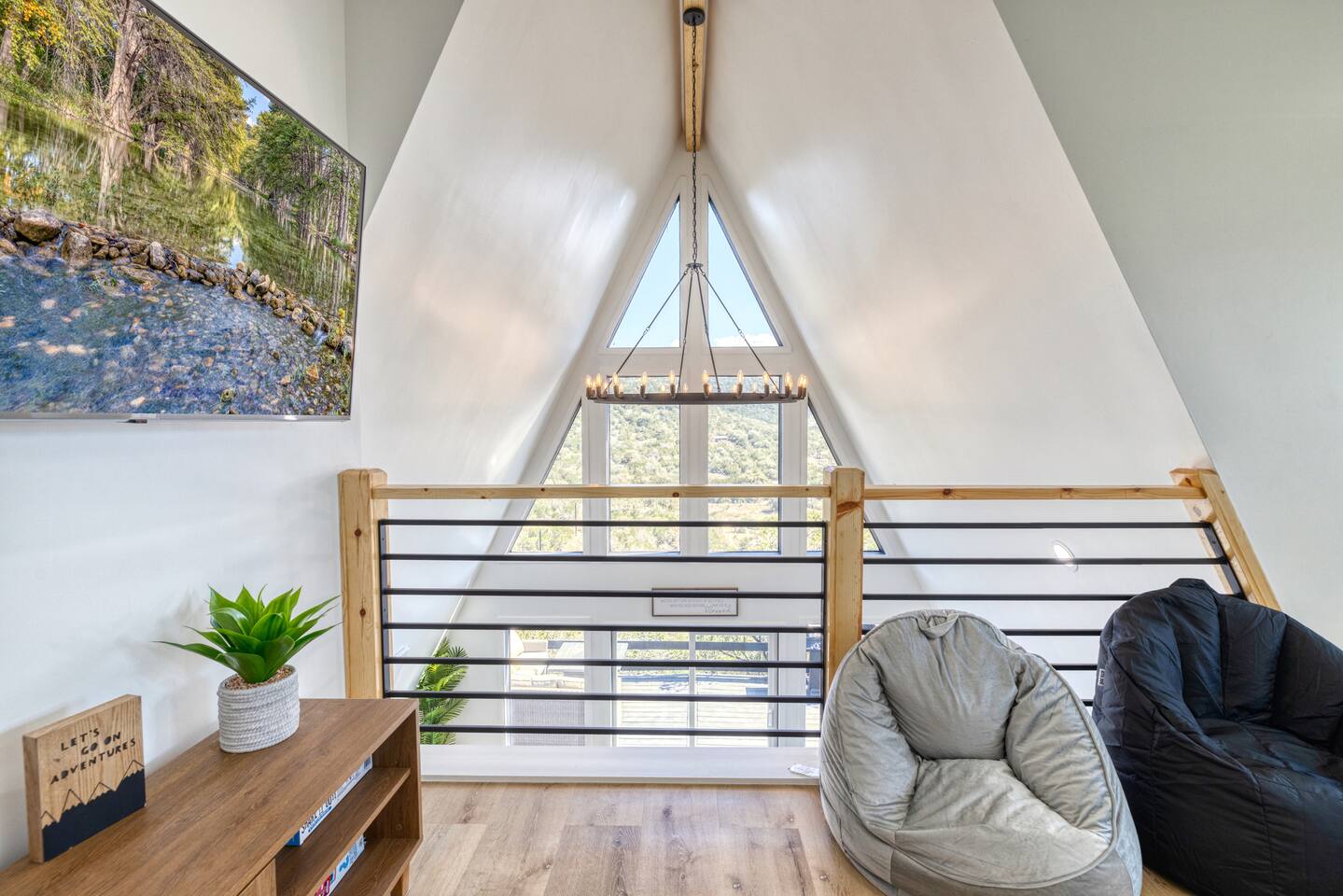 Welcome to our 5 acres Aframe home which leads you up a hill with an amazing view, which makes you feel like you're in heaven This Luxury cabin has everything you DREAMED of and we are only about a 7 minute drive to the nearest acess to the Frio River. The living area feels cozy, yet spacious with a high ceiling that shows off beautiful Pine Wood beam with a Country Living Chandelier. The A-frames giant windows overlooking the deck and the hills makes you bring the outside beauty in. It features the comfiest sofa, dining area, and our custom Pine Wood continues with the decor into our fully stocked kitchen. . The large downstairs bedroom features a queen bed, a beautiful stoned electric fireplace, a stylish reading egg chair, luggage bench, and of course a 55' Smart TV. The main bathroom is downstairs just beside the bedroom and features a luxury walk-in shower, with double vanity. Across from it you have a washer and dryer for your convenience. Then you get to go up the most beautiful custom-made stairs that continues the Pine wood with a natural wood stain that leads you to the open loft area. We offer a sofa bed, tons of board games for the kiddos and of course a 60'' Smart TV. The first bedroom upstairs has 4 twin size custom bunk beds which also gives you an amazing view out of this bedroom window. The second bedroom upstairs features 2 full size custom beds with a stylish A-frame shiplap accent wall and of course the beaty of a custom beam in the high ceiling. Second bathroom is also a walk-in shower with a modern style decor. Just outside the living room doors is the large deck with a modern outdoor seating couch, a gas fireplace, and a gas grill. While this cabin makes an ideal spot for a romantic getaway, honeymoon, wedding night, anniversary, or spiritual get aways, it's also wonderful for family and friends. Other friendly amenities included is a swings down the hill with a couple of Egg Chairs and Hammick swings, with some lounge chairs by a wood fireplace to make some smores. We are a 5 minute drive from the river, 10 minutes from Happy Hollow Drop off and 12 minutes from Garner State Park. Enjoy this beauty!! We do have a outdoor camaras at entrance door only.