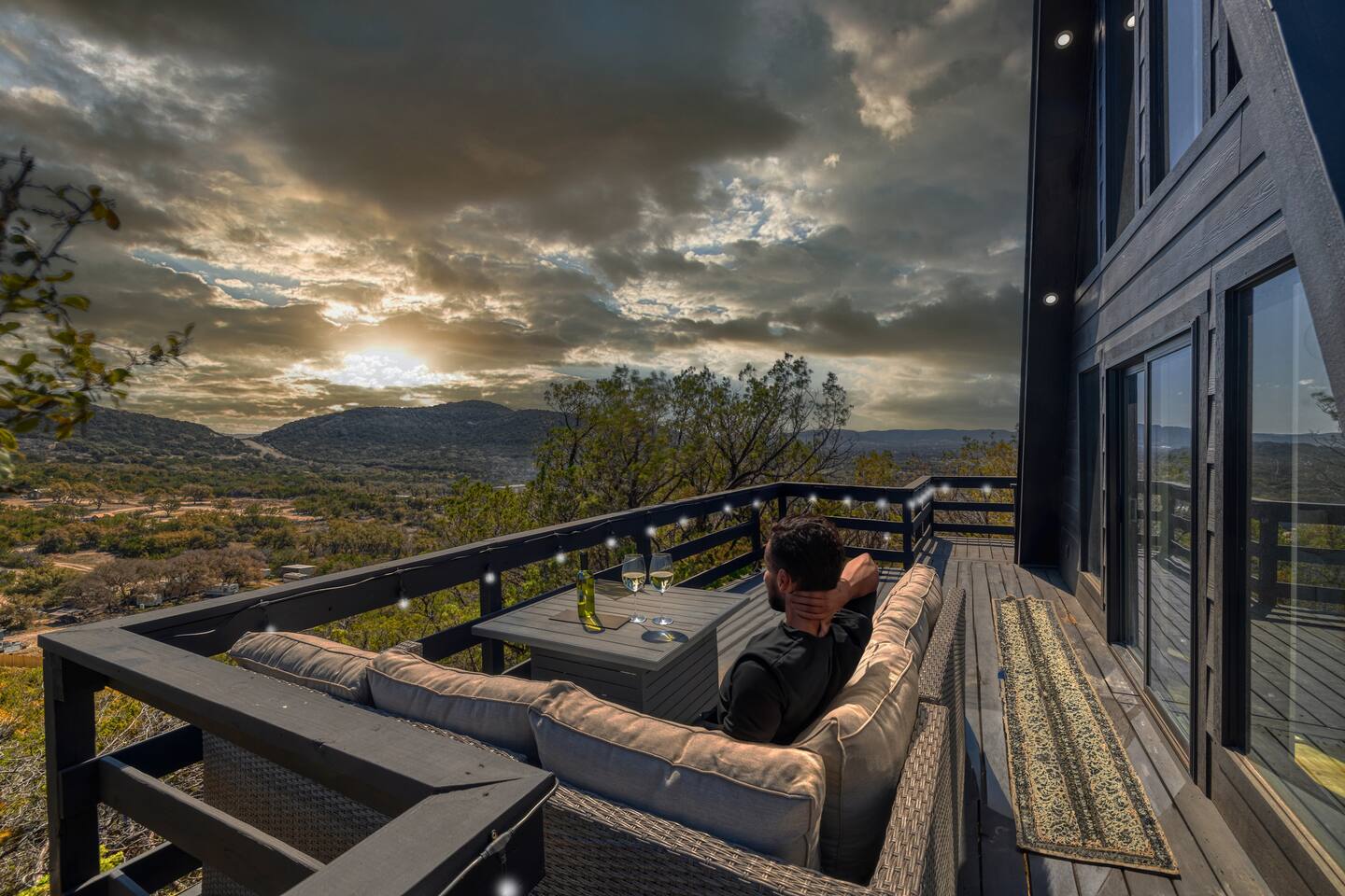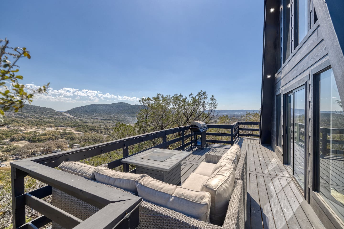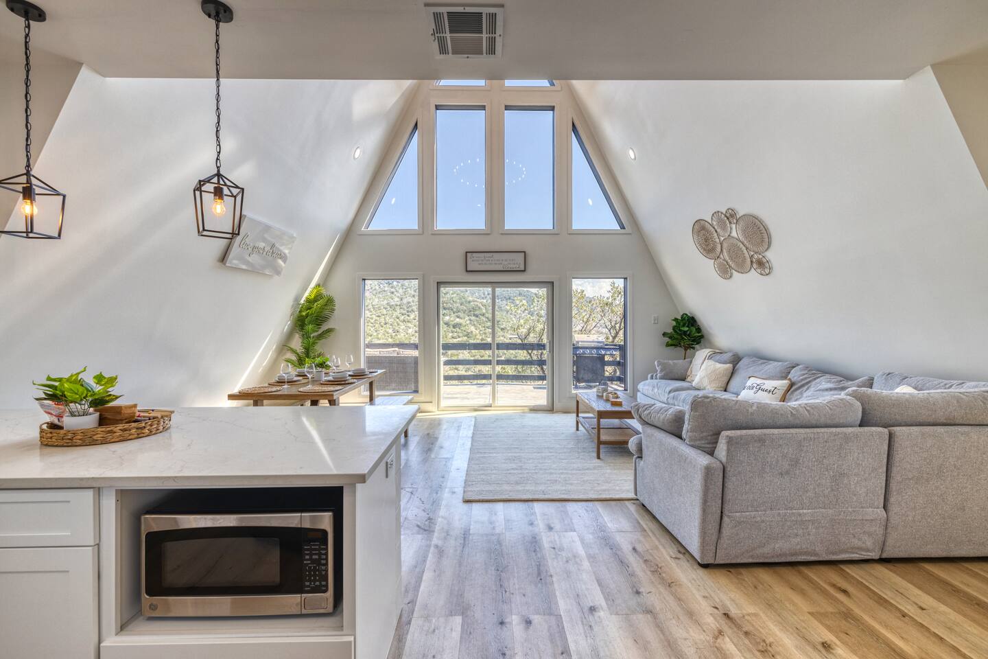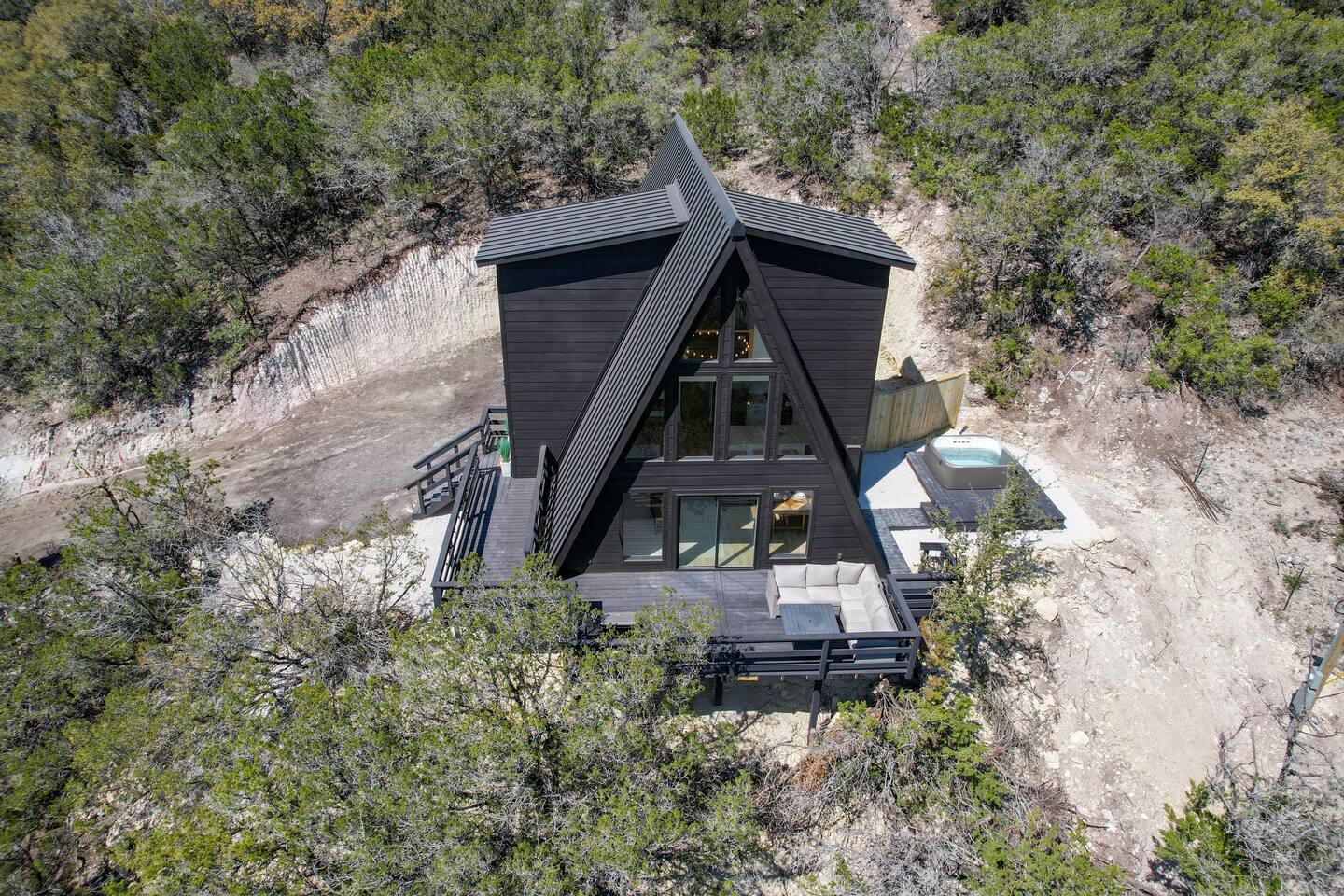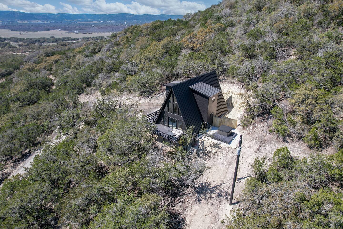 Welcome to our 5 acres Aframe home which leads you up a hill with an amazing view, which makes you feel like you're in heaven This Luxury cabin has everything you DREAMED of and we are only about a 7 minute drive to the nearest acess to the Frio River. The living area feels cozy, yet spacious with a high ceiling that shows off beautiful Pine Wood beam with a Country Living Chandelier. The A-frames giant windows overlooking the deck and the hills makes you bring the outside beauty in. It features the comfiest sofa, dining area, and our custom Pine Wood continues with the decor into our fully stocked kitchen. . The large downstairs bedroom features a queen bed, a beautiful stoned electric fireplace, a stylish reading egg chair, luggage bench, and of course a 55' Smart TV. The main bathroom is downstairs just beside the bedroom and features a luxury walk-in shower, with double vanity. Across from it you have a washer and dryer for your convenience. Then you get to go up the most beautiful custom-made stairs that continues the Pine wood with a natural wood stain that leads you to the open loft area. We offer a sofa bed, tons of board games for the kiddos and of course a 60'' Smart TV. The first bedroom upstairs has 4 twin size custom bunk beds which also gives you an amazing view out of this bedroom window. The second bedroom upstairs features 2 full size custom beds with a stylish A-frame shiplap accent wall and of course the beaty of a custom beam in the high ceiling. Second bathroom is also a walk-in shower with a modern style decor. Just outside the living room doors is the large deck with a modern outdoor seating couch, a gas fireplace, and a gas grill. While this cabin makes an ideal spot for a romantic getaway, honeymoon, wedding night, anniversary, or spiritual get aways, it's also wonderful for family and friends. Other friendly amenities included is a swings down the hill with a couple of Egg Chairs and Hammick swings, with some lounge chairs by a wood fireplace to make some smores. We are a 5 minute drive from the river, 10 minutes from Happy Hollow Drop off and 12 minutes from Garner State Park. Enjoy this beauty!! We do have a outdoor camaras at entrance door only.