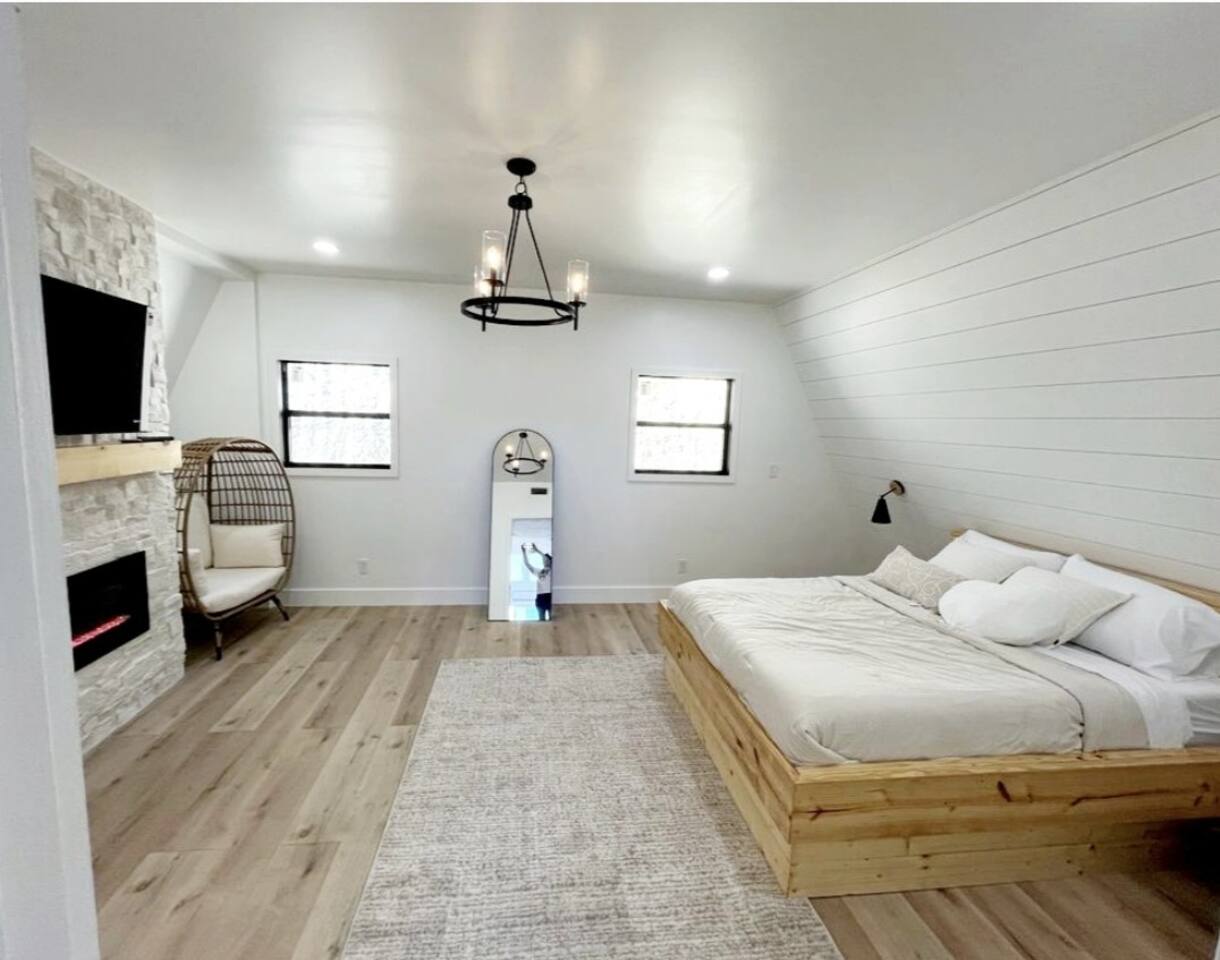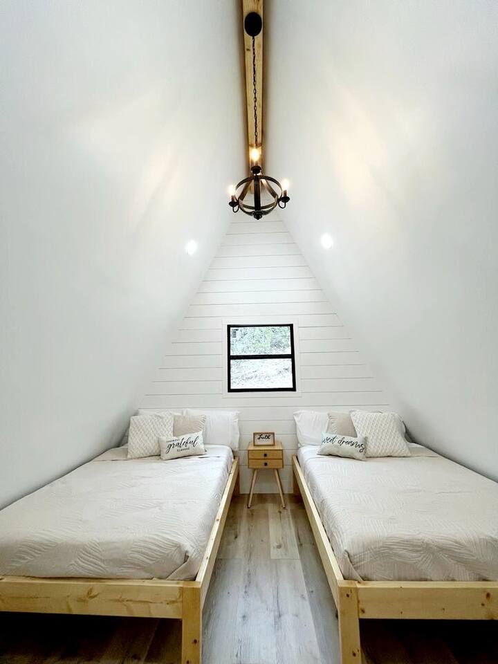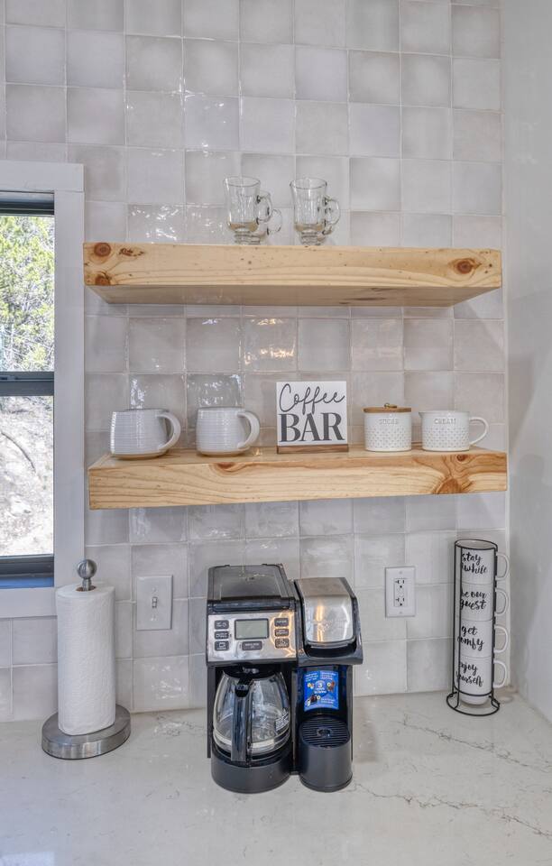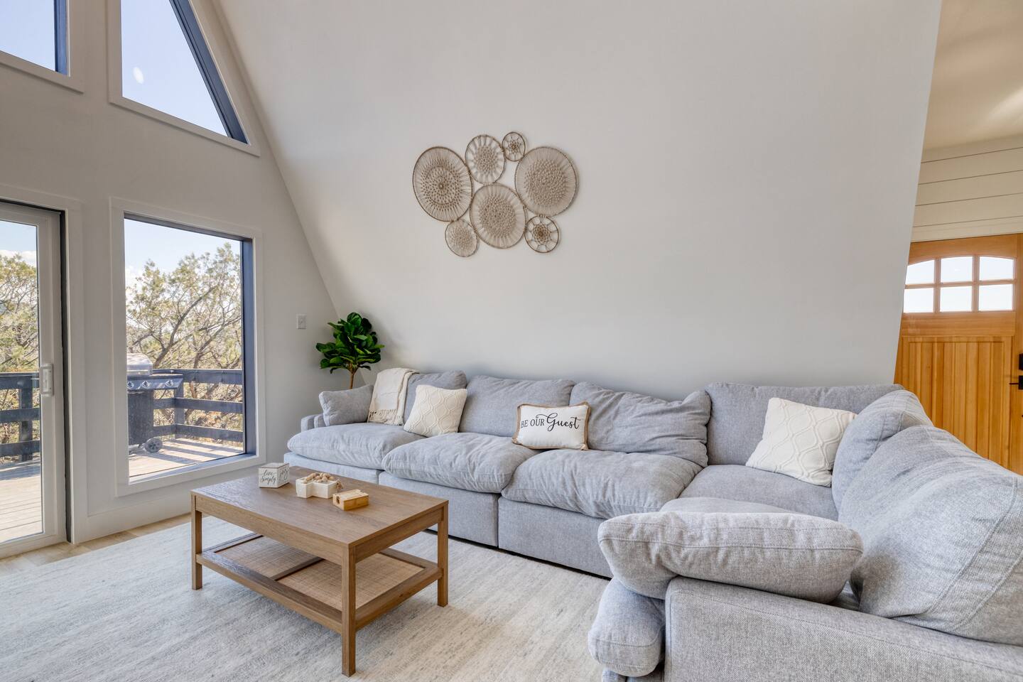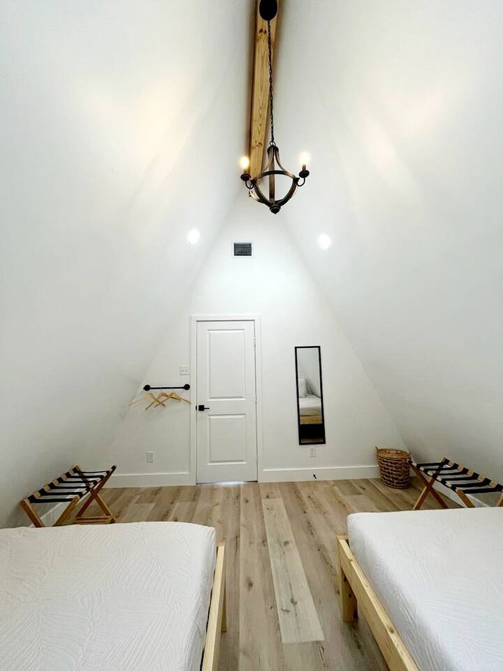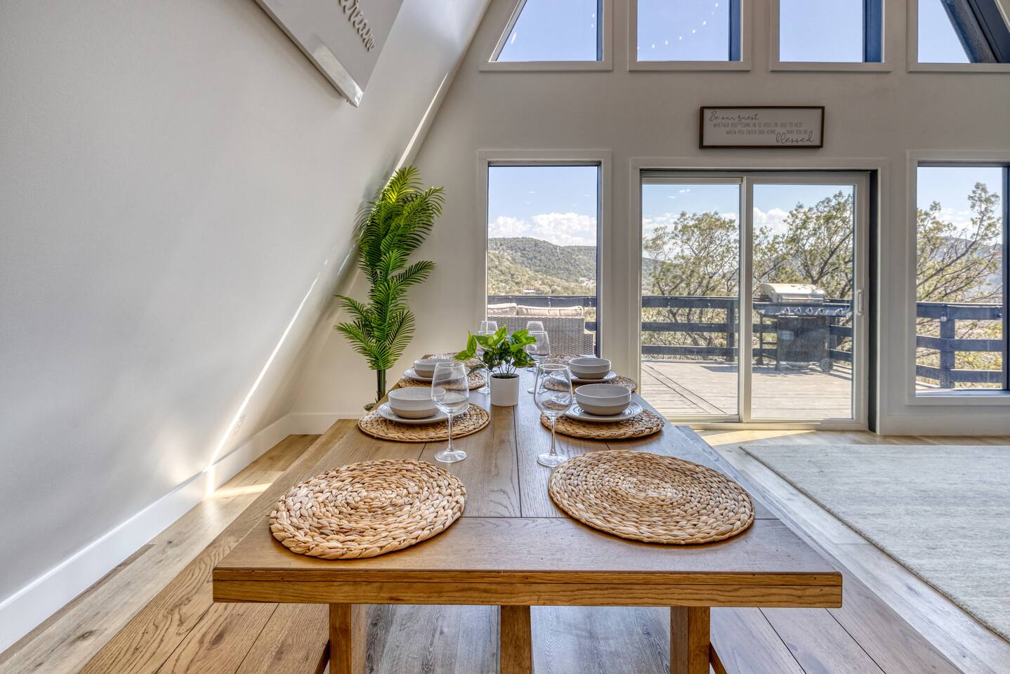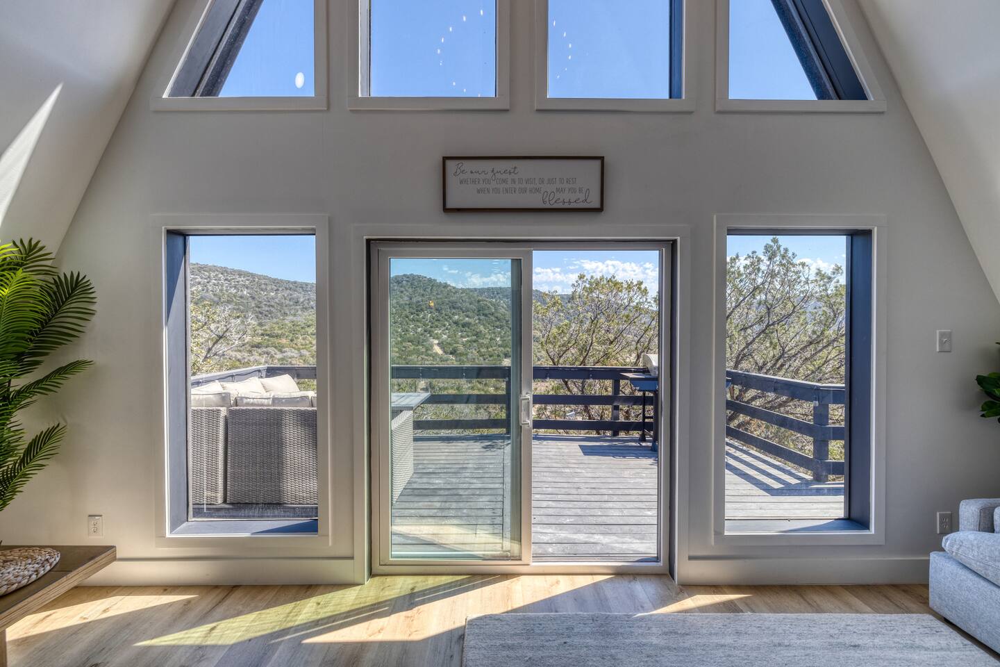 Welcome to our 5 acres Aframe home which leads you up a hill with an amazing view, which makes you feel like you're in heaven This Luxury cabin has everything you DREAMED of and we are only about a 7 minute drive to the nearest acess to the Frio River. The living area feels cozy, yet spacious with a high ceiling that shows off beautiful Pine Wood beam with a Country Living Chandelier. The A-frames giant windows overlooking the deck and the hills makes you bring the outside beauty in. It features the comfiest sofa, dining area, and our custom Pine Wood continues with the decor into our fully stocked kitchen. . The large downstairs bedroom features a queen bed, a beautiful stoned electric fireplace, a stylish reading egg chair, luggage bench, and of course a 55' Smart TV. The main bathroom is downstairs just beside the bedroom and features a luxury walk-in shower, with double vanity. Across from it you have a washer and dryer for your convenience. Then you get to go up the most beautiful custom-made stairs that continues the Pine wood with a natural wood stain that leads you to the open loft area. We offer a sofa bed, tons of board games for the kiddos and of course a 60'' Smart TV. The first bedroom upstairs has 4 twin size custom bunk beds which also gives you an amazing view out of this bedroom window. The second bedroom upstairs features 2 full size custom beds with a stylish A-frame shiplap accent wall and of course the beaty of a custom beam in the high ceiling. Second bathroom is also a walk-in shower with a modern style decor. Just outside the living room doors is the large deck with a modern outdoor seating couch, a gas fireplace, and a gas grill. While this cabin makes an ideal spot for a romantic getaway, honeymoon, wedding night, anniversary, or spiritual get aways, it's also wonderful for family and friends. Other friendly amenities included is a swings down the hill with a couple of Egg Chairs and Hammick swings, with some lounge chairs by a wood fireplace to make some smores. We are a 5 minute drive from the river, 10 minutes from Happy Hollow Drop off and 12 minutes from Garner State Park. Enjoy this beauty!! We do have a outdoor camaras at entrance door only.